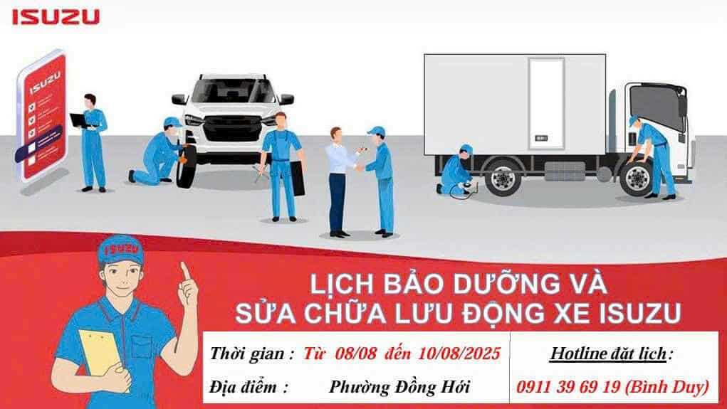 Nhằm đồng hành cùng khách hàng trong việc chăm sóc bảo dưỡng xe để đảm bảo độ bền trong quá trình sử dụng và tạo điều kiện thuận lợi cho các khách hàng ở xa không có thời gian đến xưởng DVHM để bảo dưỡng thường xuyên. Isuzu Trung Sơn tổ chức sửa chửa bảo dưỡng lưu động với thười gian địa điểm như sau: